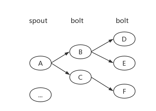 以一个wordcount 的中间 Bolt 为例,如果输入是“hello world”,则输出为”hello”,”world”,对应上图的B 节点